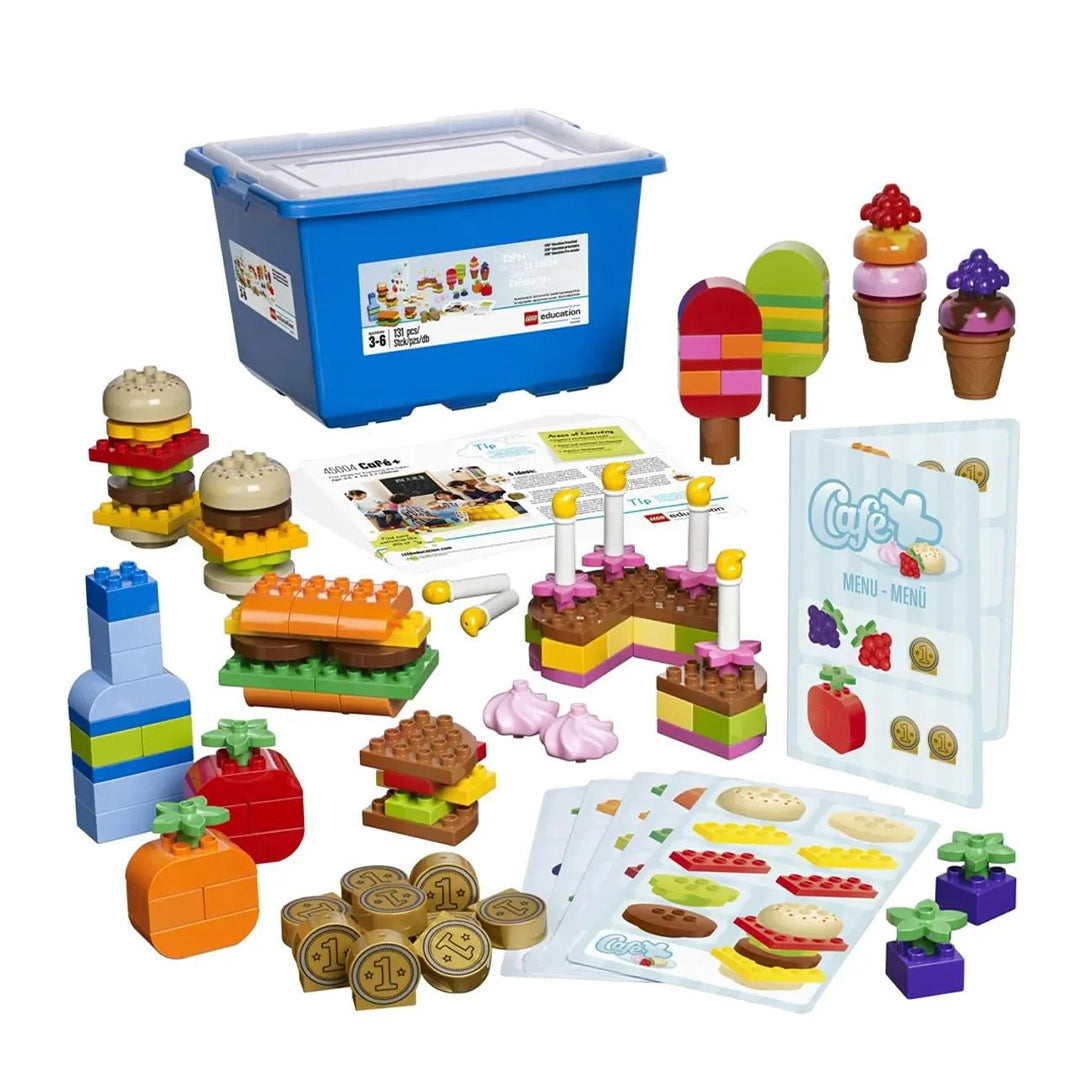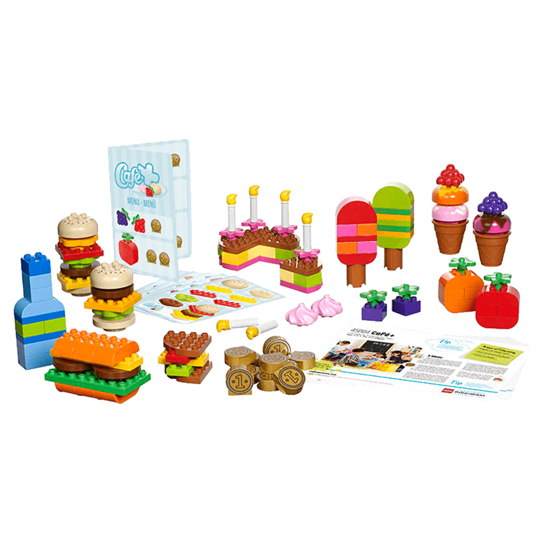 Este versátil set ayuda a los niños a desarrollar habilidades en diferentes áreas como son los números, manejar dinero y hacer intercambios, y a entender los roles sociales. Usa el menú de tarjetas para que los niños reproduzcan los dibujos que figuran en ellas y enséñales a sumar productos.