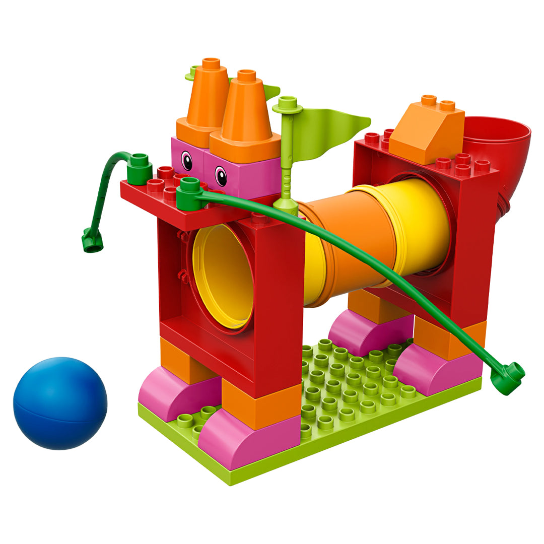 • Colorida colección de tubos únicos, ladrillos LEGO® DUPLO®, bolas, puertas y cestas.