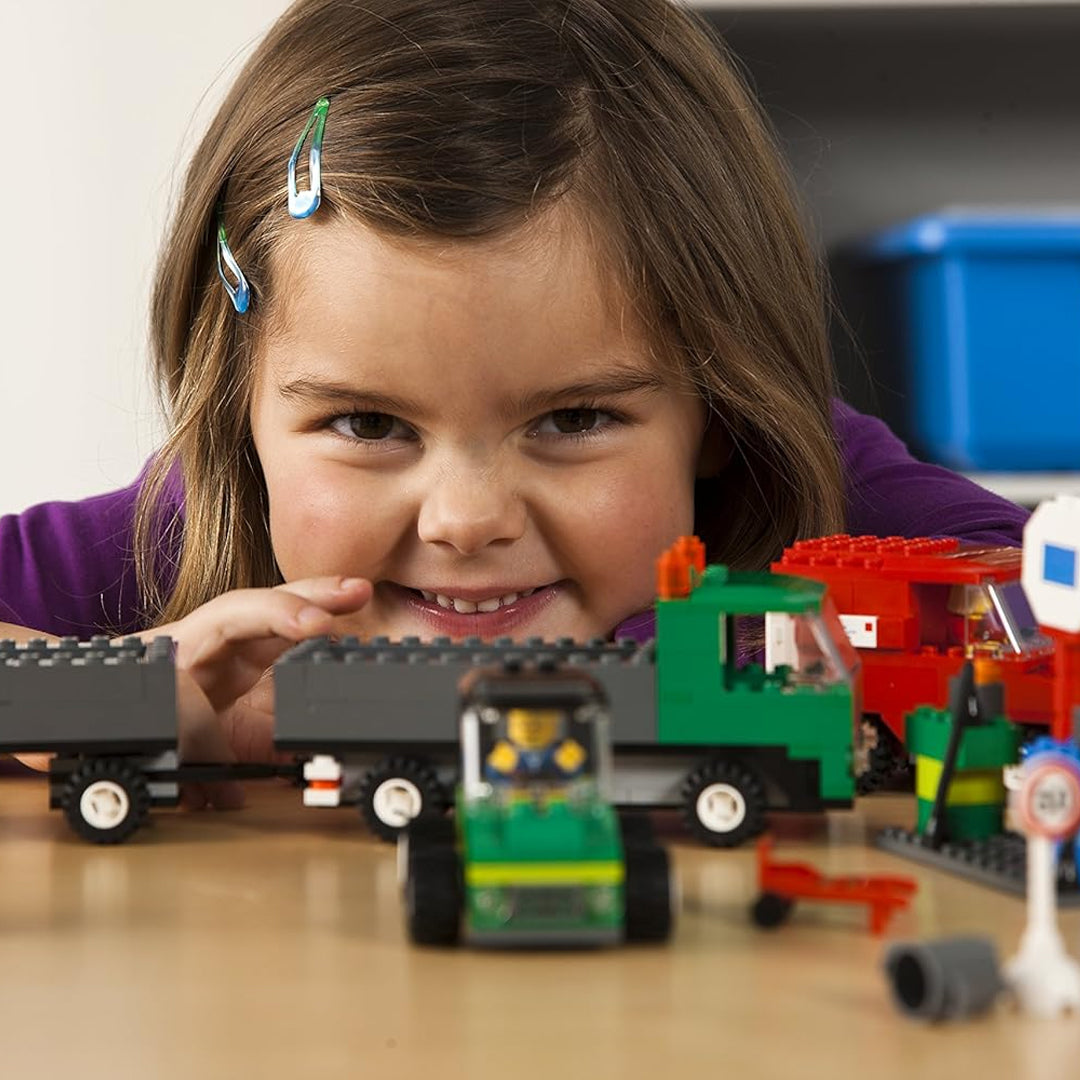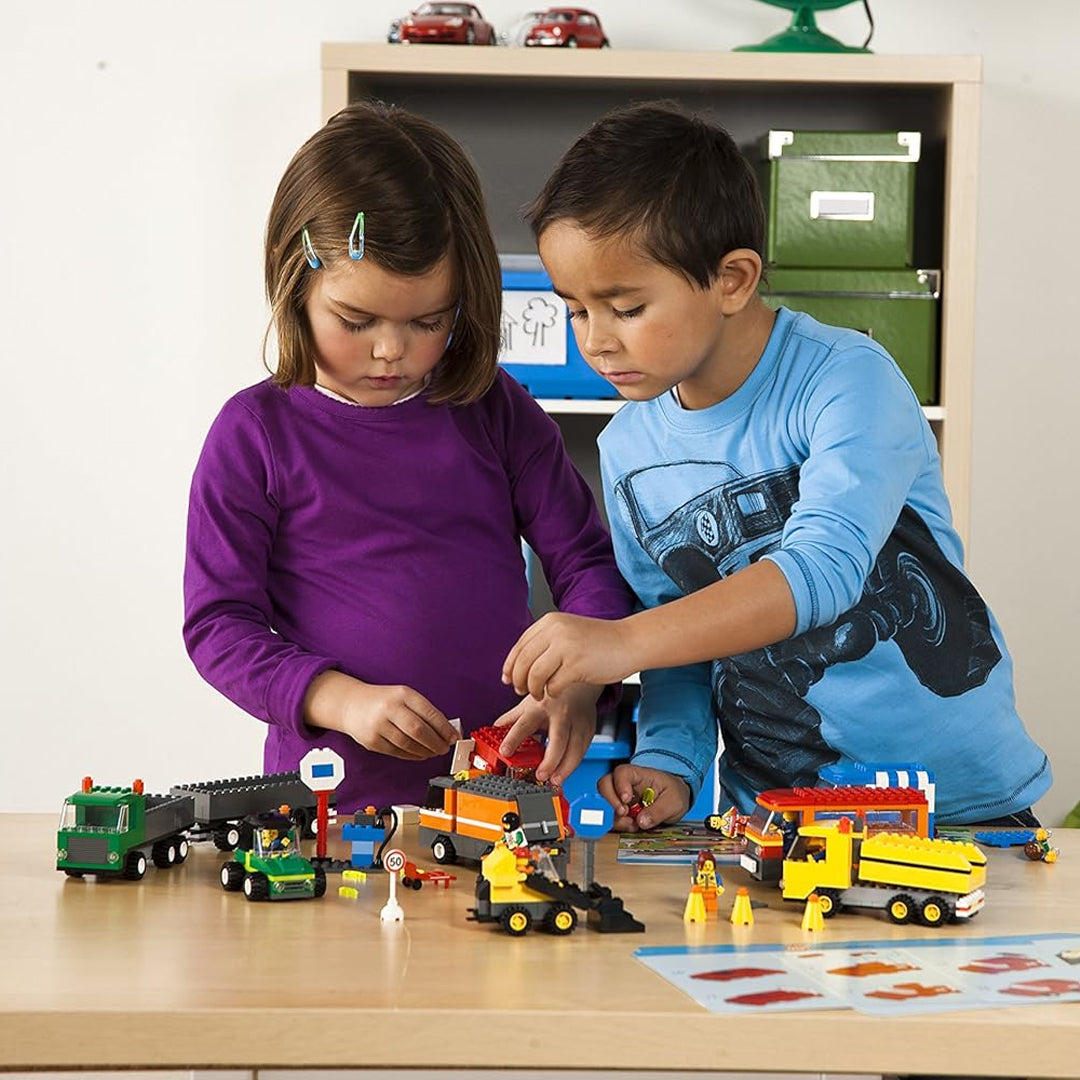 Los estudiantes pueden construir un autobús, camión de basura, cargador frontal, camión con remolque o una furgoneta de helados, promoviendo el juego colaborativo y la comprensión de los servicios comunitarios.