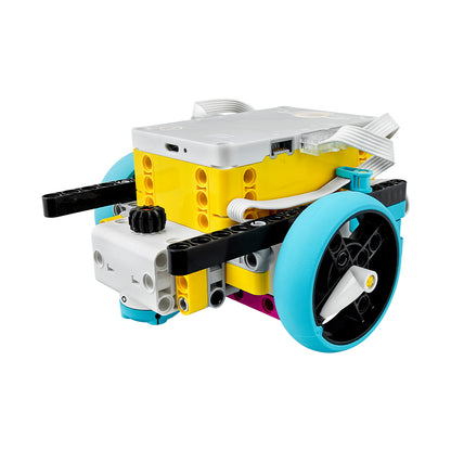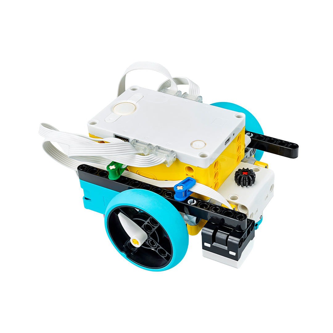 • LEGO® Technic and System elements in an attractive colour scheme, with 2 large wheels, rack and pinion gears, a SBC building plate, a large motor and a colour sensor.