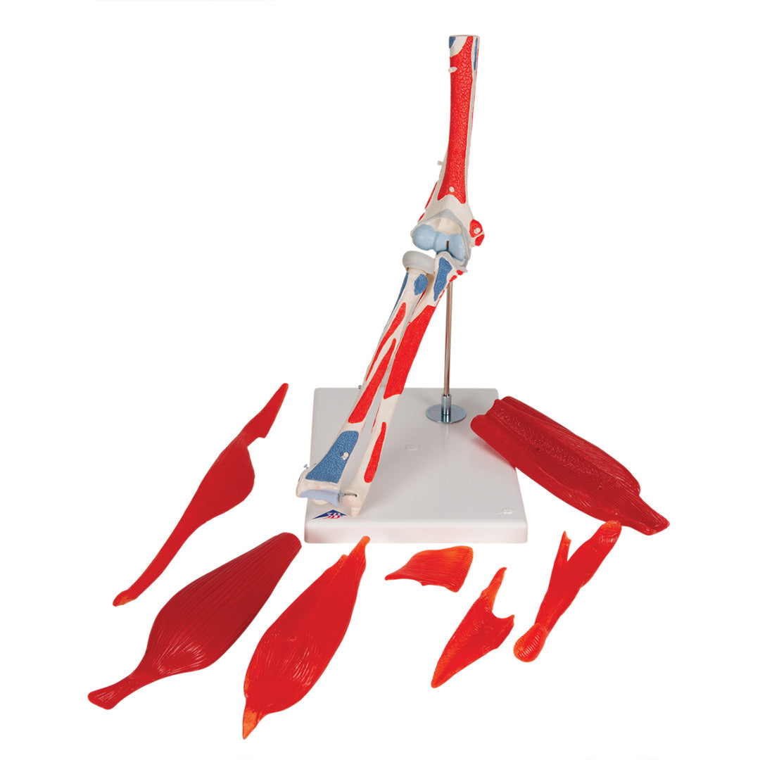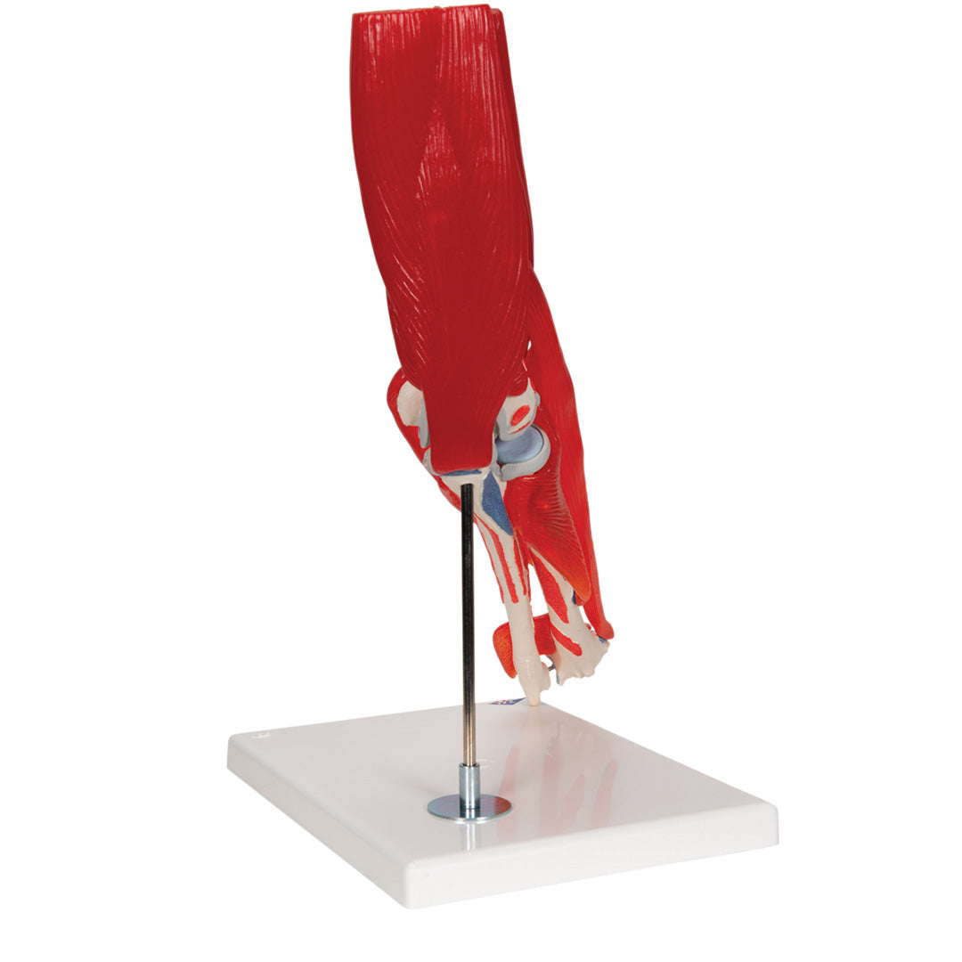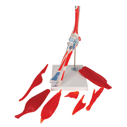 El modelo muestra el codo derecho de un hombre con todos los músculos y los orígenes y las inserciones musculares del húmero, así como del radio y el cúbito.