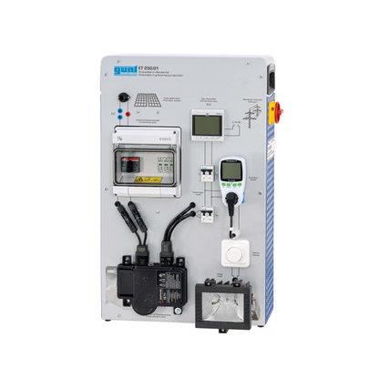 Various system components are required to feed solar PV modules into a public power grid. These components ensure the conversion and recording of the solar PV power as well as the safety of the system. The ET 250.01 test module contains these components and is designed as an extension to the ET 250 test bench. Via an electrical connection to the ET 250, the generated direct current is transmitted from the photovoltaic modules to the socket of the ET 250.01.