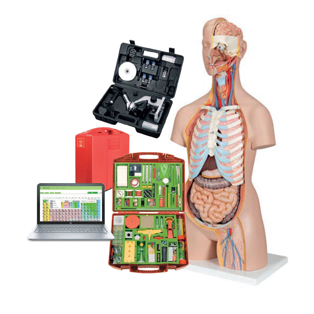 Completa cobertura de los contenidos de ciencias de 1º a 8º básico. Contiene práctico mueble para mantener ordenados todos estos materiales.