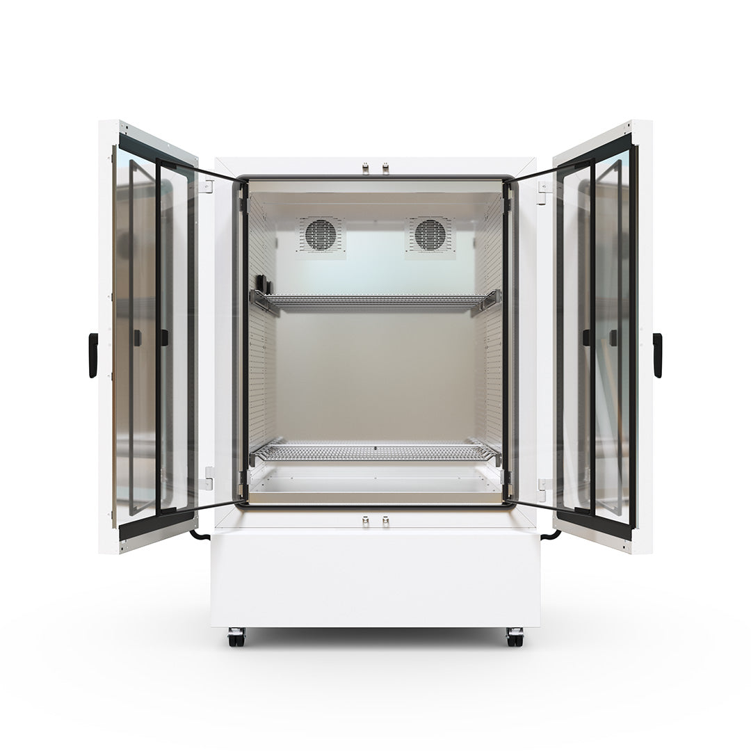 Cámara de clima constante con límites ampliados de temperatura y humedad, gracias a su sofisticado equipamiento técnico, la KBF PRO domina sin problemas todo tipo de ensayos de materiales, ya sea a -20°C, en condiciones THB, a +85°C y 85% de humedad relativa. Equipo seguro y potente gracia a la innovadora tecnología de atemperación, funcionamiento a prueba de fallos a largo plazo gracias a su tecnología acreditada de compresores y a su cámara interna de acero inoxidable, triángulo señalizador con indicación luminosa de estado, panel de control ergonómico con regulador de programas de pantalla táctil y menor consumo energético gracias a la moderna tecnología de refrigeración por inversor.