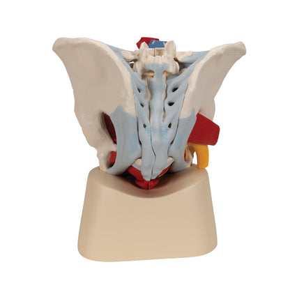 La porción derecha de la pelvis nos muestra secciones y posiciones de las arterias común, externa e interna así como de la vena común y exterior de la pelvis. Además están representados el plexo sacral, el nervio ciático, el nervio pudendo, el nervio dorsal del pene, los nervios escrotales anteriores los Nn. escrotales anteriores, los Nn. perineales y los Nn. anales inferiores así como el conducto eferente se representan abiertos. Muestra todas las estructuras anatómicas con todo detalle: ambos huesos coxígeos, la sínfisis pélvica, el sacro y el coxis, así como la quinta vértebra lumbar. La mitad izquierda del cuerpo de la quinta vértebra lumbar así como cortando el lsacro ni el coxis, también puede separarse del modelo gracias a un imán. Así también se hace visible una porción de la cauda equina dentro de la columna vertebral.