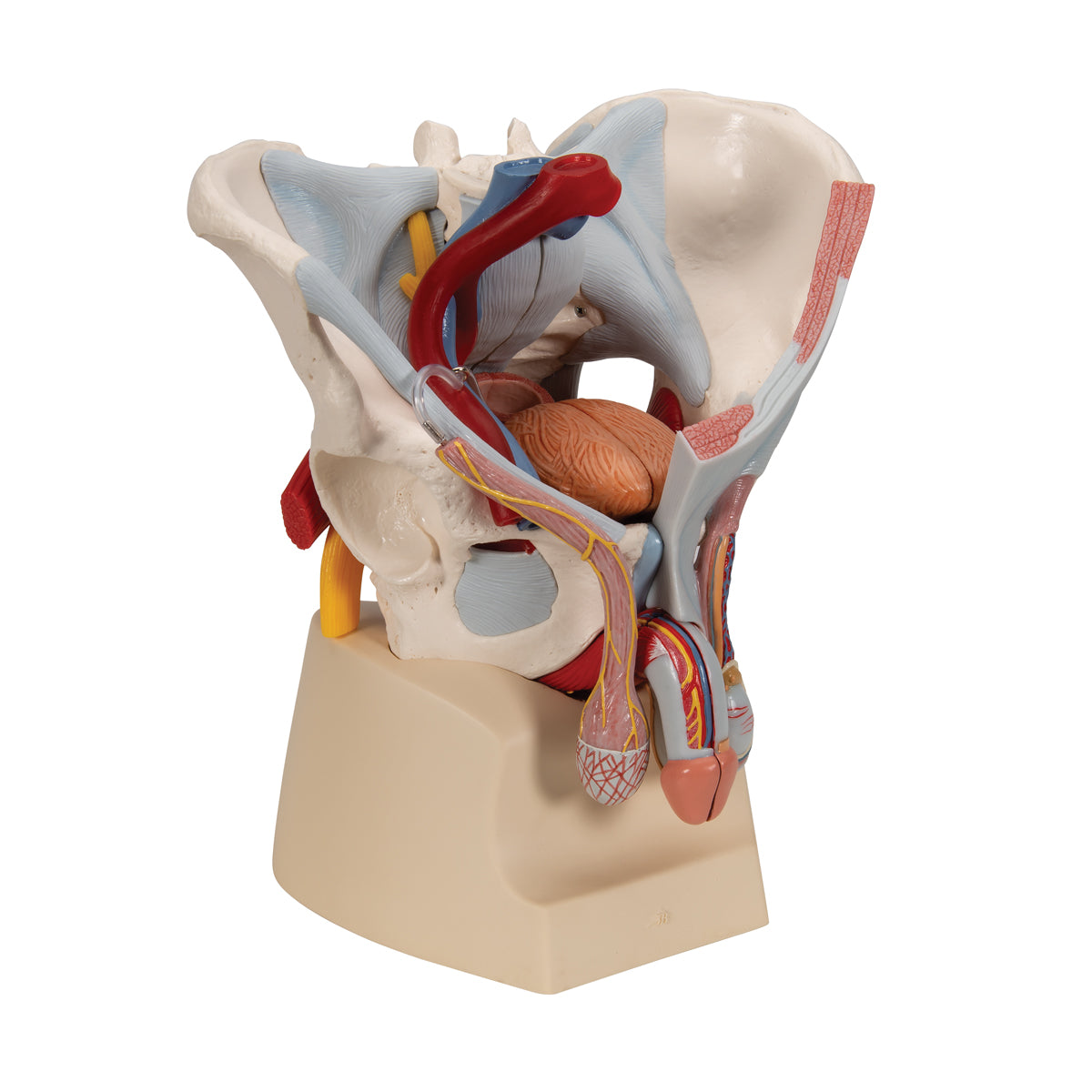 Este modelo de 7 piezas de la pelvis masculina nos muestra con gran fidelidad de detalles la relación espacial de los huesos, ligamentos, vasos y nervios, así como la musculatura del suelo pélvico y los órganos externos de la pelvis y gónadas masculinas. Muestra al completo el suelo pélvico, que ha sito cortado por un corte medianero. La porción de la derecha del esfínter anal externo, del M. isquiocavernoso, de los Mm. transversos profundo y superficial del perineo y del músculo bulboesponjoso pueden retirarse unidos.