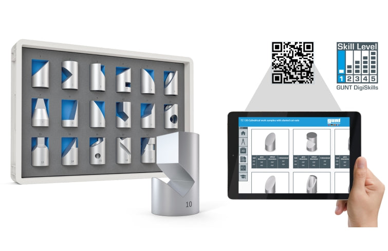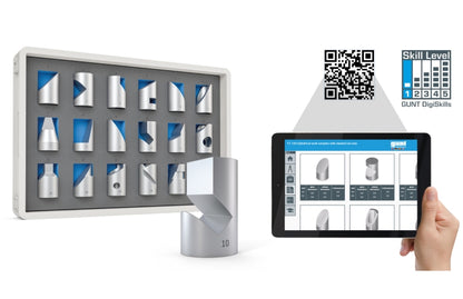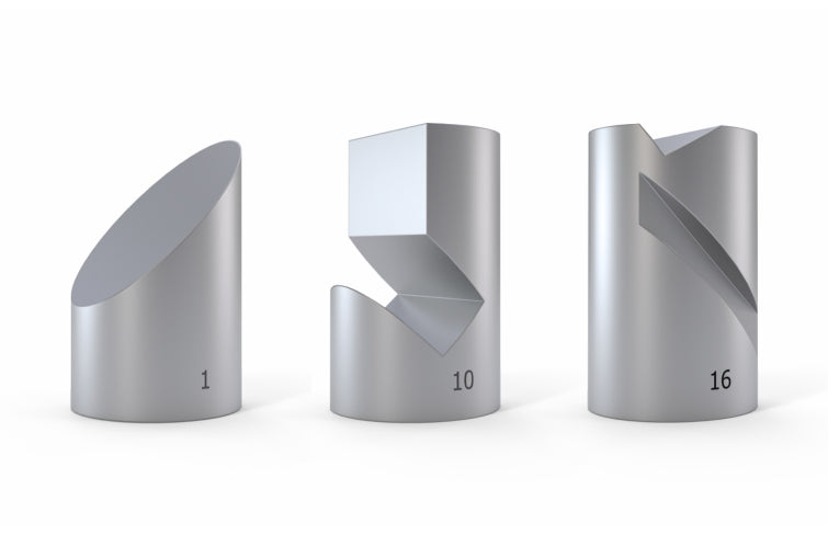 El kit contiene 18 modelos cilíndricos de aluminio con cortes paralelos y oblicuos a los ejes espaciales. Dichas piezas tienen un buen acabado superficial, lo que les hace idóneas no solo para prácticas de representación sino también para prácticas de medición. Para un aprendizaje óptimo, se recomienda que los estudiantes realicen las prácticas individualmente.